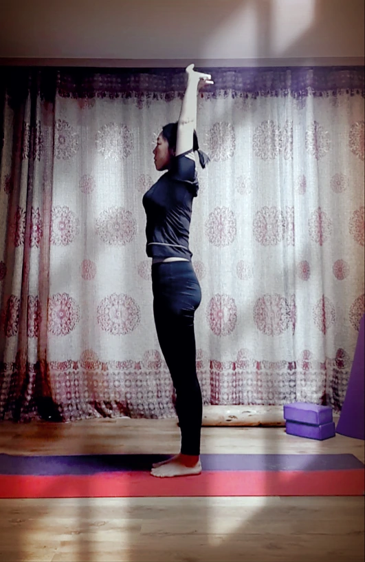 1. 위 기본 산 자세에서 숨을 들이마시며 깍지 낀 손을 손바닥이 위로 가게 머리 위로 든다.