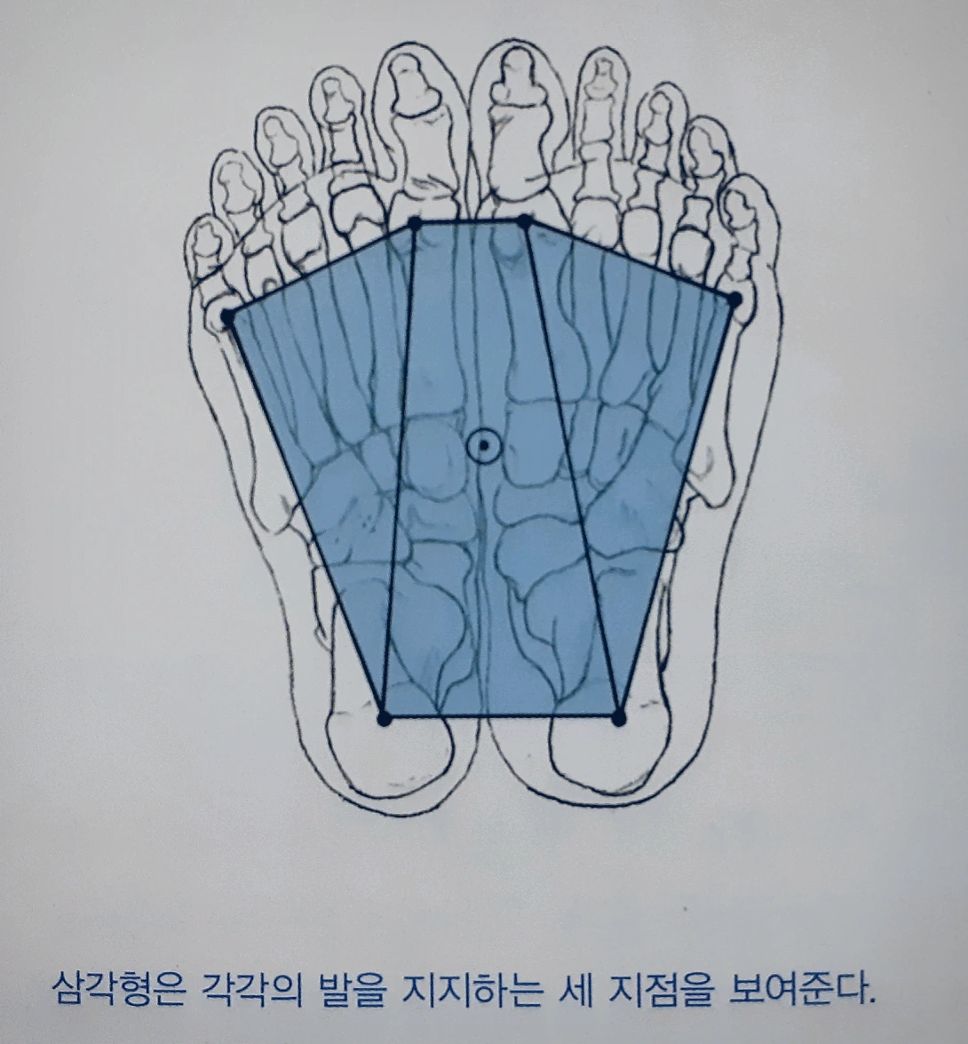 체중이 발 전체에 고르게 분산되는 것에 집중한다. 위 발그림의 세 점을 의식하면 좋다.