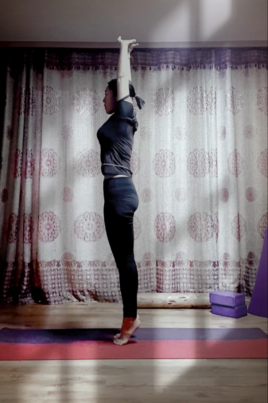2. 숨을 들이마시면서 뒤꿈치를 천천히 들어 발가락과 발 앞부분으로 지탱한다. 숨을 내쉬면서 팔을 귀 뒤로 가게 하는 느낌으로 쭉 뻗는다.
