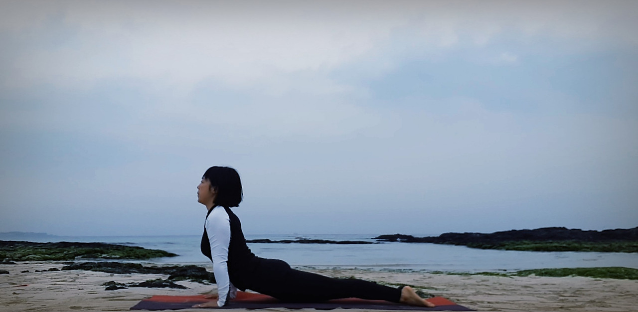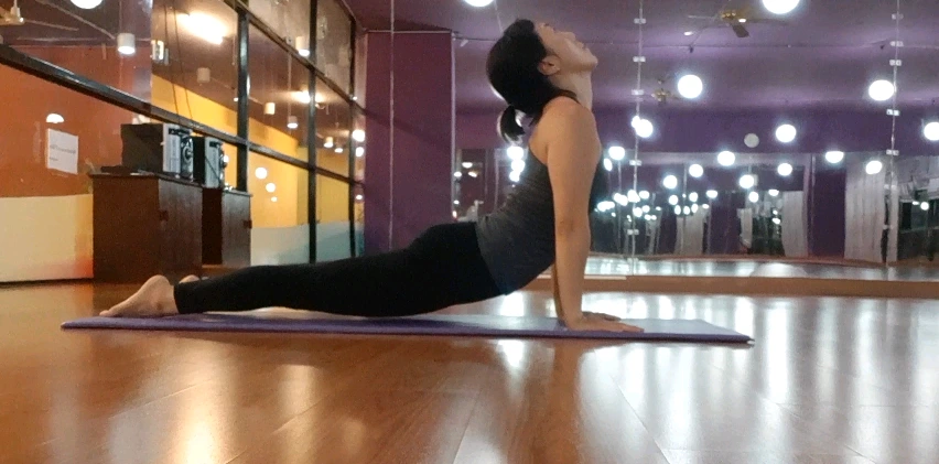 3. 다시 숨을 들이마시면서 손으로 바닥을 누르며 상체를 일으킨다.(Bujangasana) 여기까지는 코브라 자세와 같다. 익숙해지면 코브라 자세를 생략하고 다음 단계로 넘어간다.
