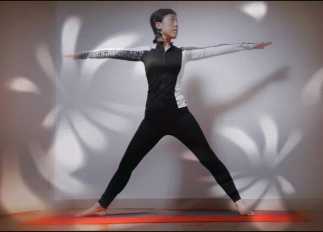 2. 양발을 최대한 벌리고 오른발은 바깥으로 돌리고 양팔은 벌려서 수평이 되게 어깨 높이로 올린다.