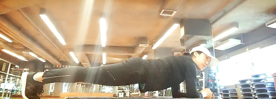 플랭크. 버티기 자세로 골반과 척추를 지지하는 코어근육과 복근이 발달한다. 팔을 어깨 너비로 벌려 지지하고 엉덩이를 어깨 높이만큼 들어 유지한다. 엉덩이의 높이는 어깨보다 높아도 낮아도 안된다.