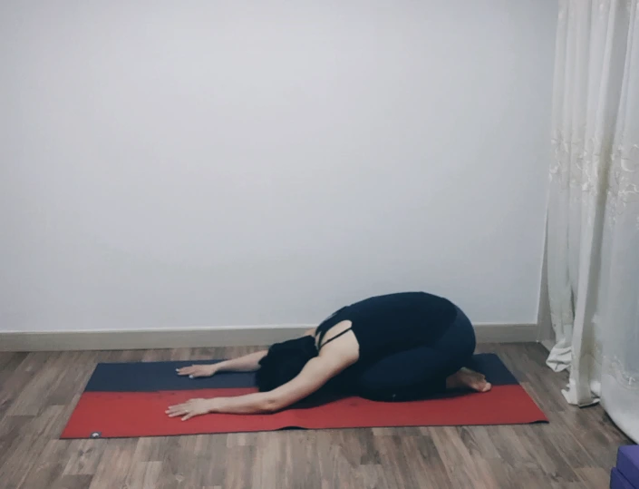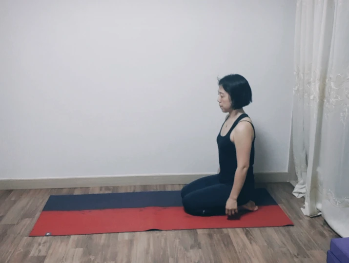 들이마시는 숨에 vajrasana 바로 앉고 내쉬는 숨에 손을 앞으로 뻗어 엎드린 자세로 어깨와 옆구리, 등을 스트레칭해준다.