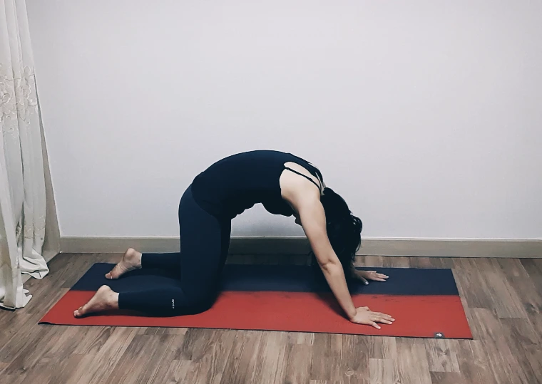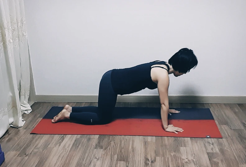 들이마시는 숨에 소 자세 내쉬는 숨에 고양이 자세를 반복한다.