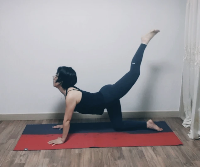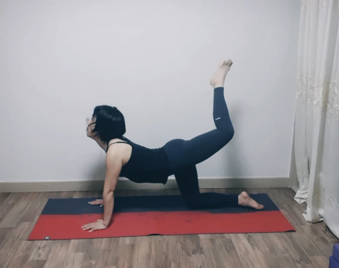 그대로 무릎을 세워 일어난다. 들이마시는 숨에 오른쪽 다리를 뒤로 뻗어 올린다. 뻗는 것이 힘들면 구부린 채로 뒤로 들어 올린다. 가슴을 펴고 턱은 들어 숨을 최대한 들이마신다.