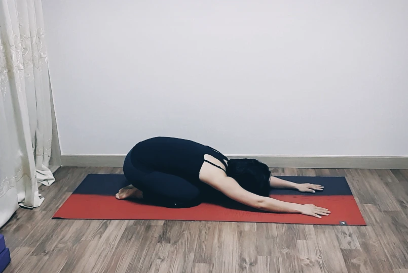 무릎을 꿇고 앉았다가 두 팔을 어깨 넓이로 매트 앞쪽으로 최대한 뻗어 엎드리고 엉덩이는 발바닥에 닿도록 한다.