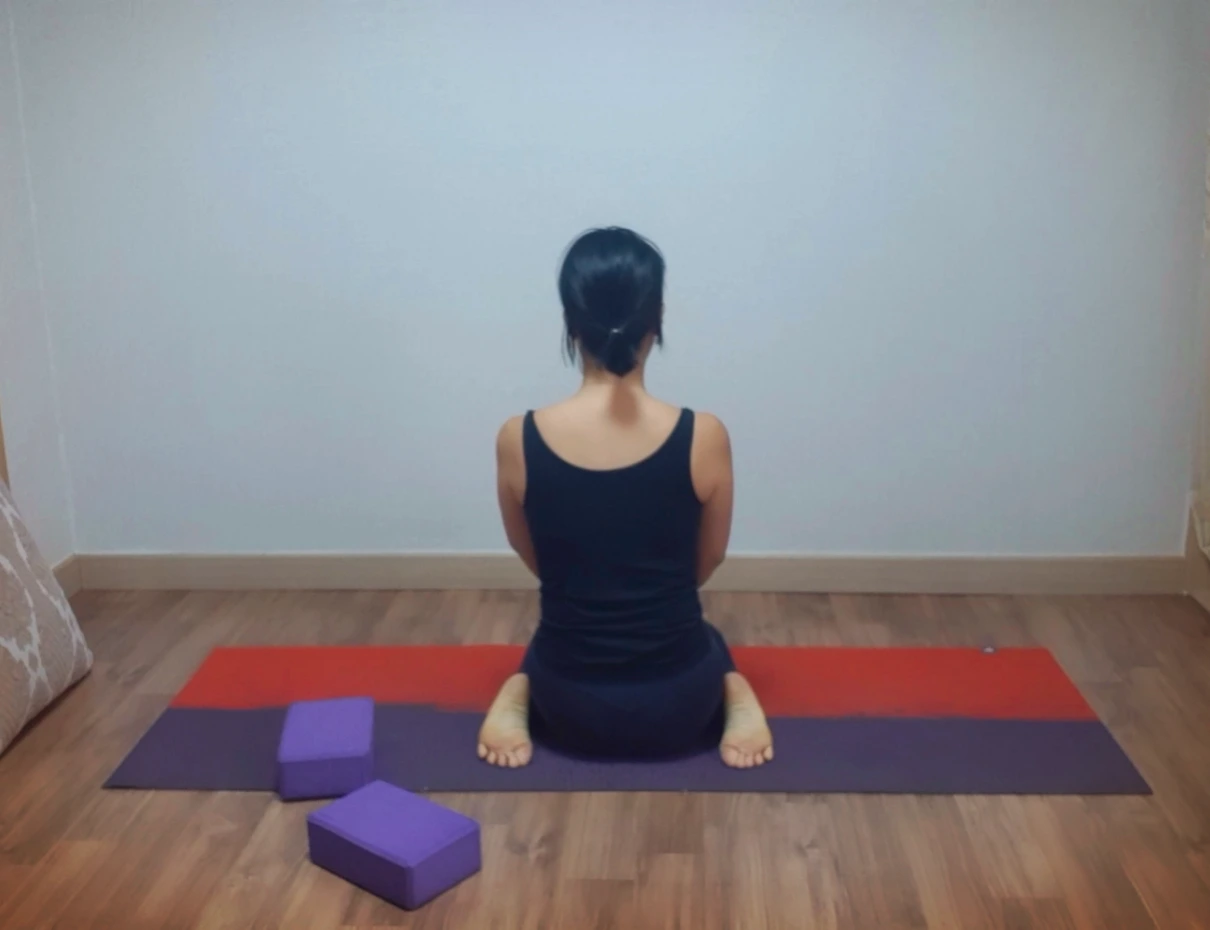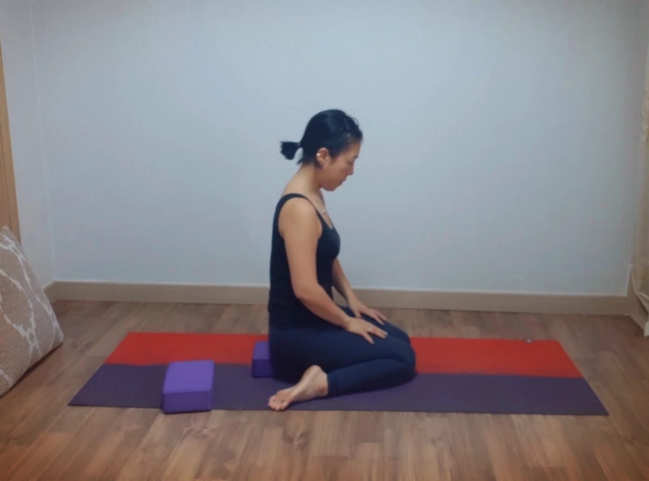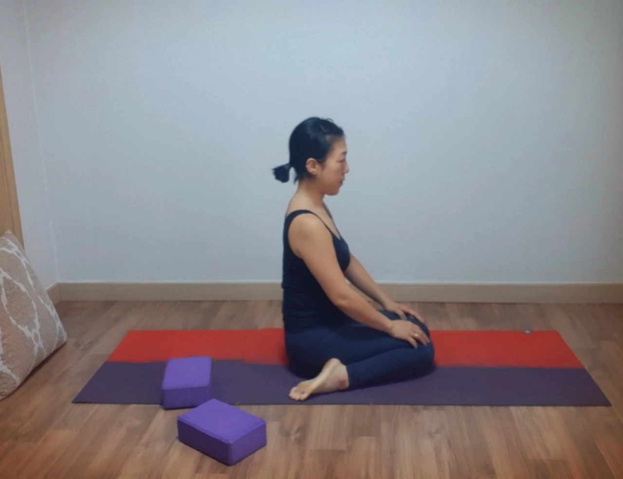 무릎이나 허벅지에 통증이 심할 경우에는 양 무릎에 간격을 두거나 엉덩이 밑에 블록이나 담요를 둔다.