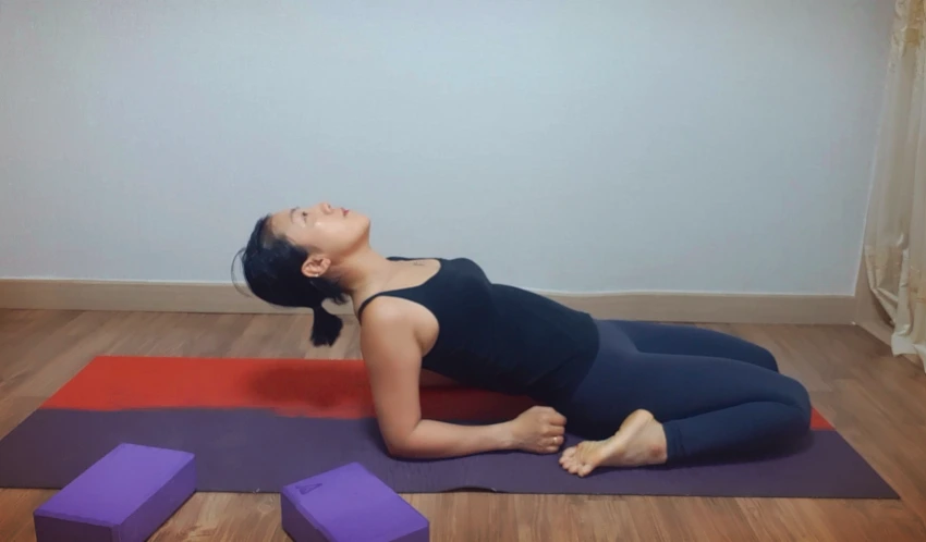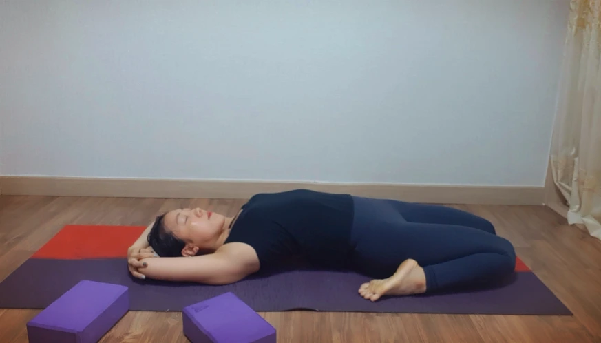 영웅자세에서 천천히 팔로 바닥을 짚으면서 뒤로 눕는다.