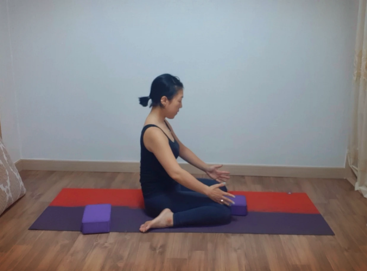 양손을 무릎에 올려놓고 천천히 숨을 들이마시고 내쉬며 배로 호흡한다.
