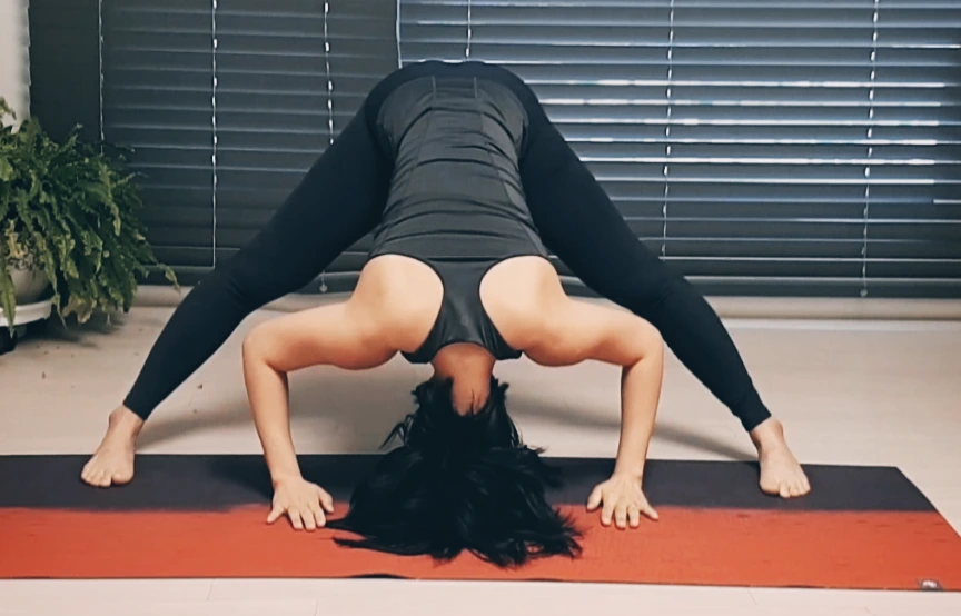 발을 벌리는 정도를 조정해서 두 다리는 곧게 뻗고 머리는 바닥에 닿은 상태로 몸이 흔들림 없이 중심이 잡혀야 한다.