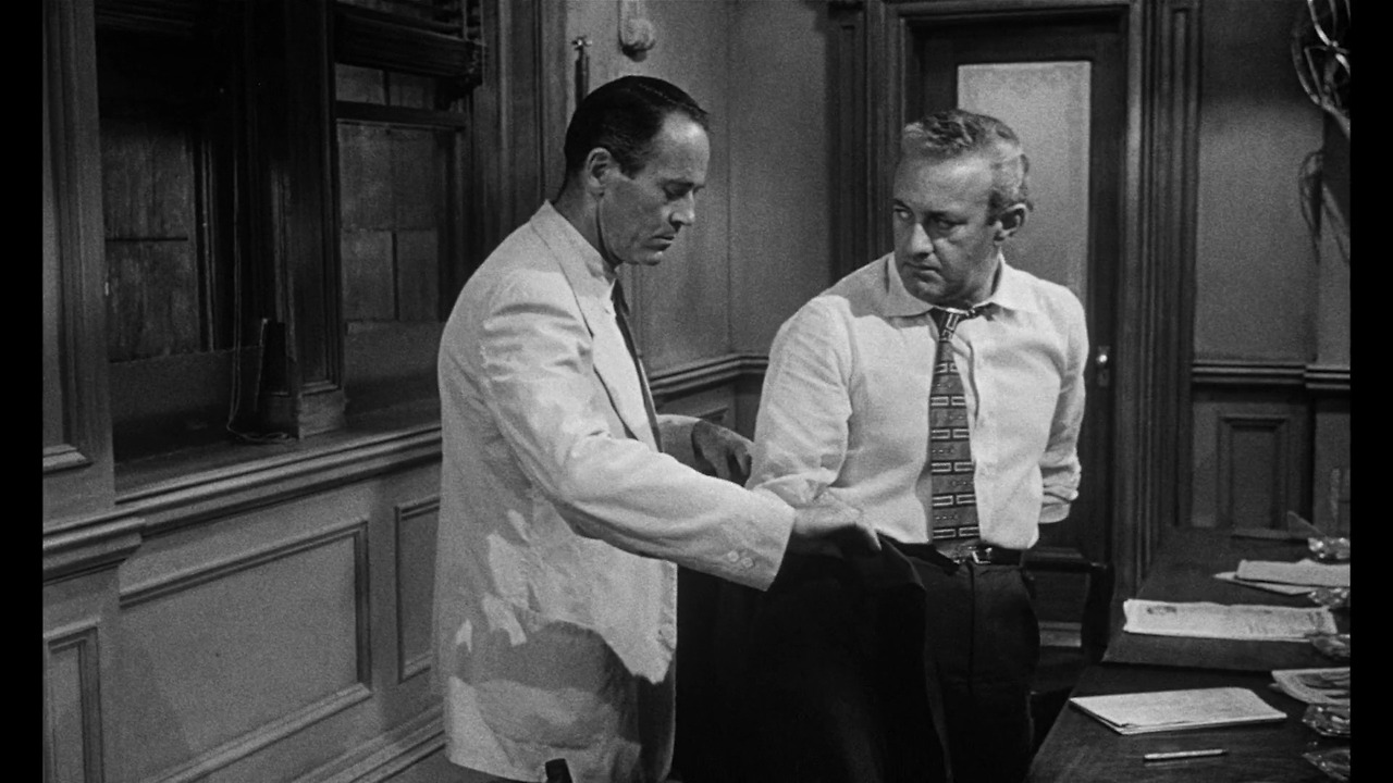 그런데 한편으로 이 밀실 속의 이야기를 되짚을 때 진정으로 탄복해야 할 것은 바로 미장센 부분이다. 처음과 끝부분을 제외하면 영화는 대부분의 러닝타임 동안 배심원실 안에서 진행된다. 8번 배심원의 말처럼 한 시간이 조금 넘는 시간이니 관객 입장에서는 배심원들의 의사결정 과정을 실시간으로 보는 것이나 다름없다. 그런데 이 작은 공간을 배경으로 한 화면의 밀도와 구성은 실로 대단한 수준이다. 수십 년이 지나는 동안 수많은 연극화와 리메이크가 이어져 오고 있는 이유가 단순히 각본의 논리정연함에만 있지는 않다는 소리다.