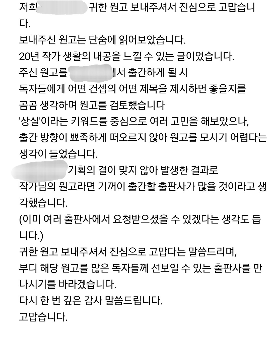 **어떤 출판사의 매우 사려 깊은 반려 메일 때문에 그나마 힘을 냈다. 너무 감사하다고 말씀드리고 싶다. 용기를 모두 잃어갈 때쯤 그러니까 이틀 전에 받은 메일이라서, 그래도 힘을 내서 이 글도 쓸 수 있었다. **