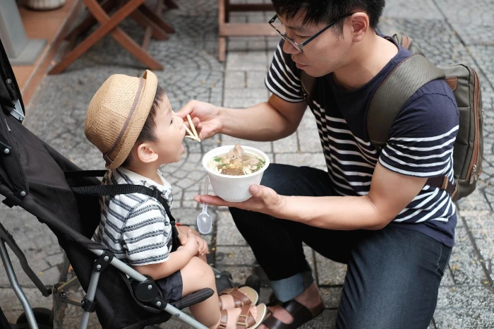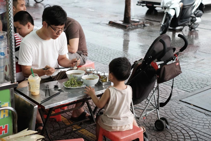 호텔에 막 체크인을 하고 저녁을 먹으러 나오던 길이었다. 우리는 적당한 식당을 찾아 걷고 있었고, 길가에 놓인 작은 손수레에서는 쌀국수를 만들어 팔고 있었다. 간혹 오토바이들이 멈춰서 쌀국수를 한 그릇씩 포장해가거나 몇몇은 그 주위에 서서 작은 그릇을 손에 들고 훌훌 먹고 있었는데, 무심코 그 곁을 지나쳐가다가 구수한 냄새에 이끌려 우리는 뒷걸음으로 걸어서 그곳으로 되돌아갔다. 호기심이 일어서 간단히 맛만 볼까 싶어 한 그릇을 주문한 뒤, 능숙한 손놀림으로 말아주는 쌀국수를 받아 들고는 한 모금 맛을 봤는데, 우와. 정말 깜짝 놀랄 만큼 진하고 깊은 맛이 났다. 그렇게 우리는 유모차에 앉은 얼이와 함께 길가에 쪼그리고 앉아 그 쌀국수를 국물 한 방울 남기지 않고 싹 비웠고, 얼이도 처음 먹어보는 고수가 듬뿍 들어간 쌀국수를 호로록호로록 맛있게 먹었다. 그리고 또 걷다가 맛있는 냄새에 이끌려, 이번에는 길가에 있는 작은 테이블과 그보다 더 작은 의자에 셋이 모여 앉아 두 번째 쌀국수로 두 번째 저녁을 먹었다.