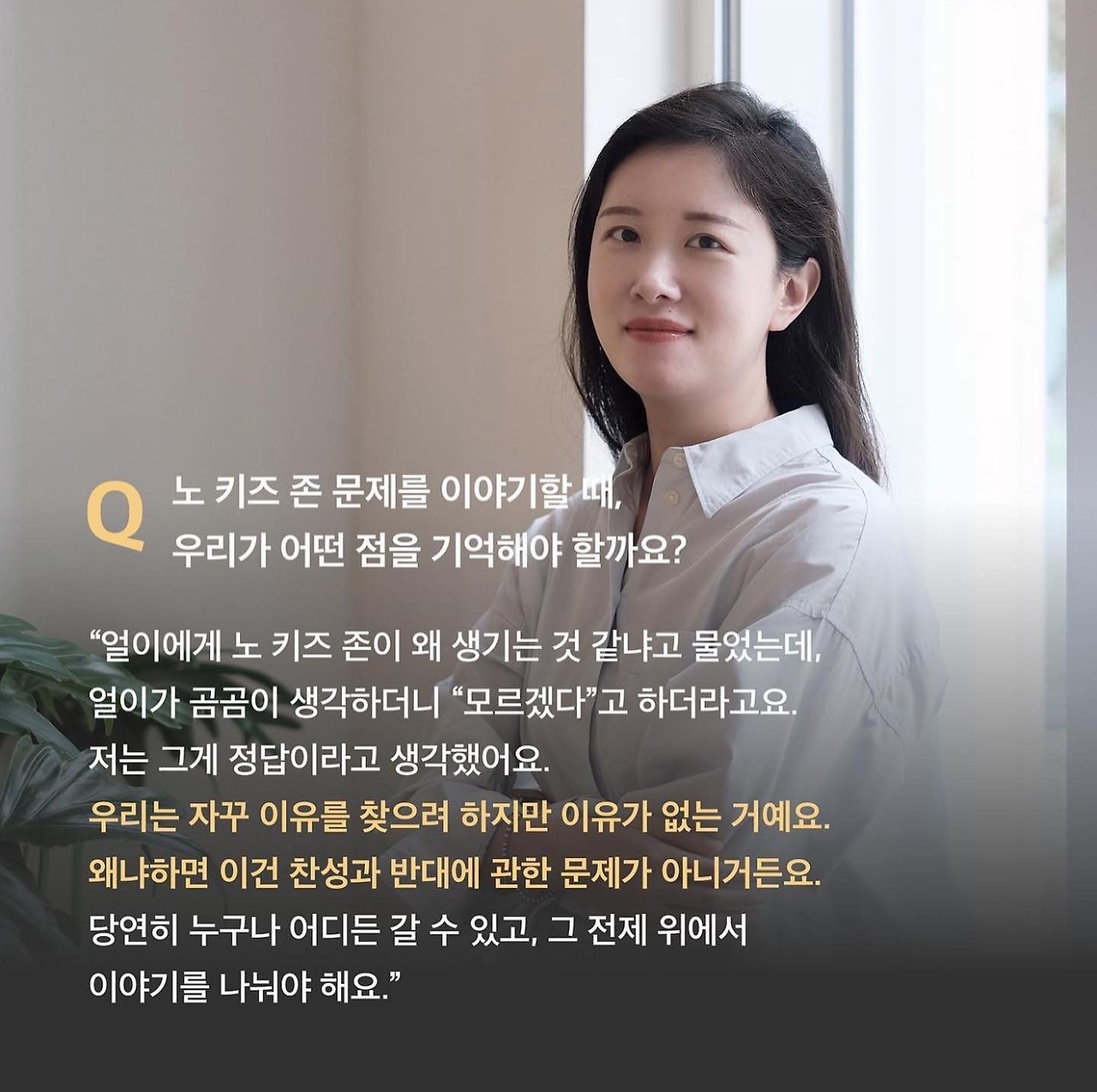 '노 당신 존'이란 글도 와닿았습니다. 영화 <그린북>에 빗대서 설명하셨는데요, "(아이를 데리고) 아무 데나 다니지 말라"는 말까지 들으셨다고요. "'노 키즈 존'이 있는 곳에서 '노 시니어 존', '노 중년 존'이 생기는 것은 어쩌면 당연하다"는 말씀처럼, 누군가를 차별하고 배제하는 것을 당연하게 여겨서는 안 된다고 생각합니다. 노 키즈 존 문제를 이야기할 때, 우리가 어떤 점을 기억해야 할까요?