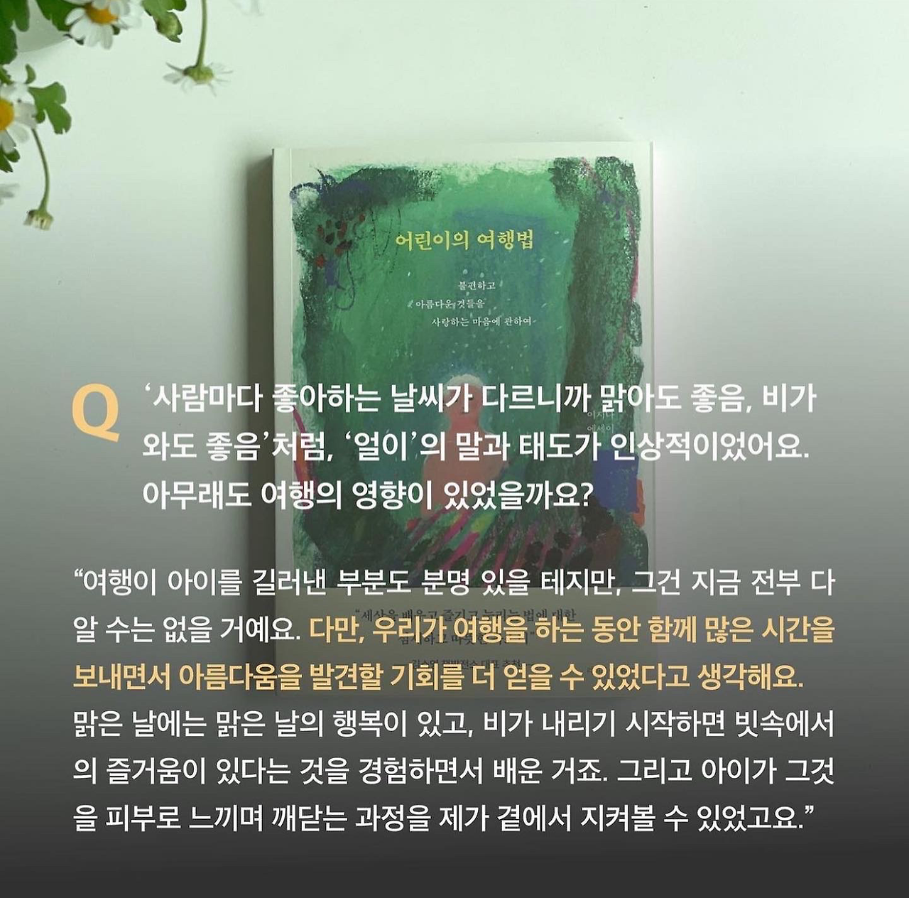 여행이 우리에게 주는 커다란 선물 중 하나는 시간이에요. 여행이 아이에게 영향을 주고 아이를 길러낸 부분도 분명 있을 테지만, 책에서 말했듯 그건 우리가 지금 전부 다 알 수는 없을 거예요. 다만, 우리가 여행을 하는 동안 함께 많은 시간을 보내면서 아름다움을 발견하는 기회를 더 얻을 수 있었다고 생각해요. 맑은 날에는 맑은 날의 행복이 있고, 비가 내리기 시작하면 빗 속에서의 즐거움이 있다는 것을 경험하면서 배운 거죠. 그리고 아이가 그것을 피부로 느끼며 깨닫는 과정을 제가 아주 가까이 곁에서 지켜볼 수 있었고요. 서로에게 귀를 기울이는 시간이 많았던 덕에 그 순간들을 놓치지 않고 더 많이 발견하고 기록할 수 있었던 것이라 생각해요.