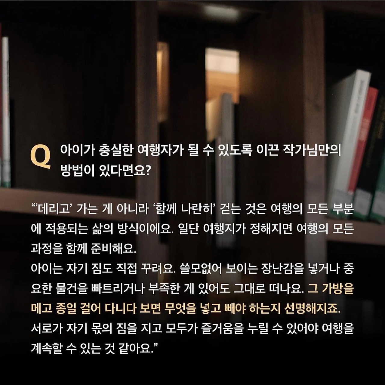 이제는 아이가 먼저 공부하고 준비해서 여행을 이끌기도 한다고요. 아이에게도 소중한 경험이고, 또 함께하는 가족들에게도 의미 있는 순간이 될 것 같아요. 아이가 충실한 여행자가 될 수 있도록 이끈 작가님만의 방법이 있다면요?