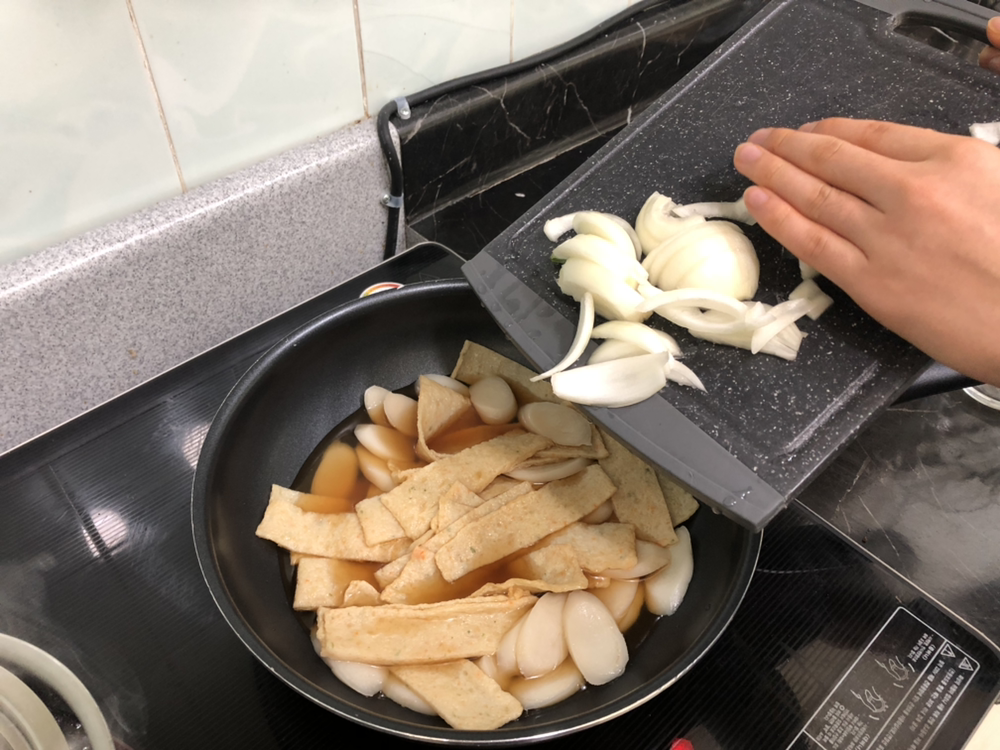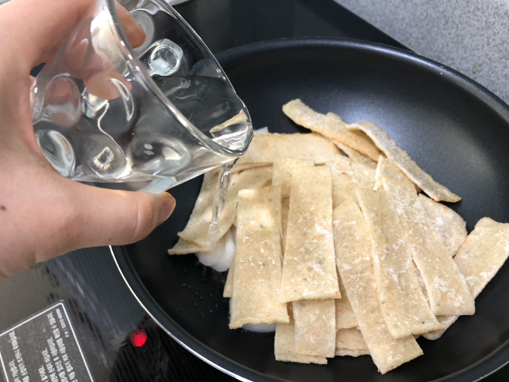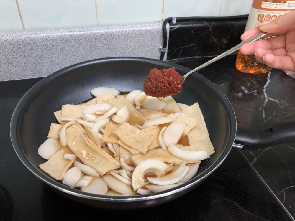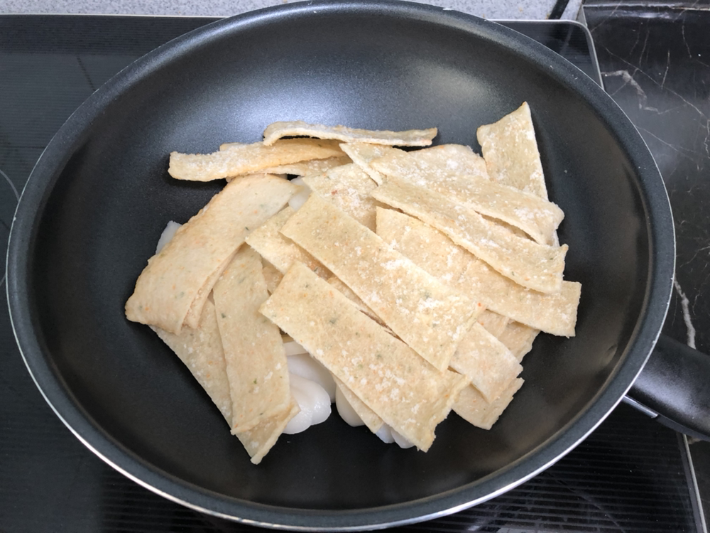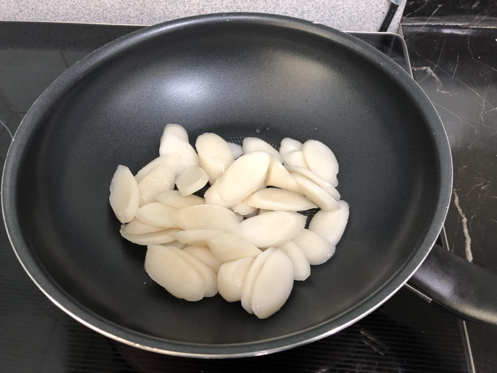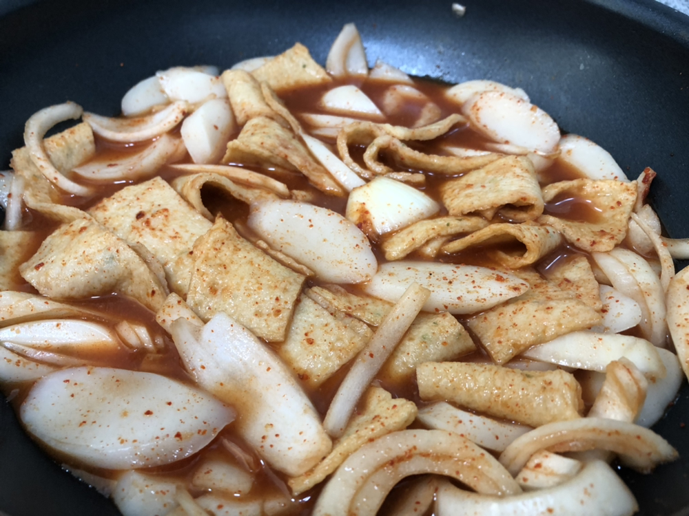 웍에 떡과 오뎅을 넣는다. 요 정도 양이 2인분 정도 될듯.
