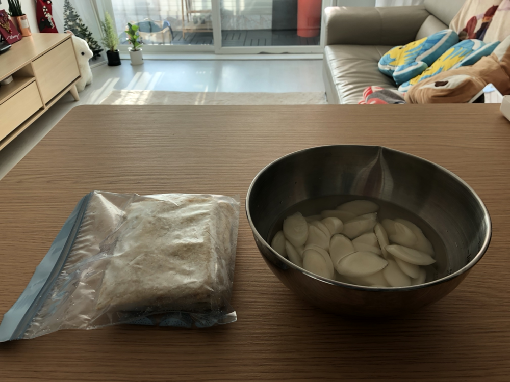 떡국떡과 어묵. 둘다 냉동실이 있었어서 물에 담가 한동안 해동을. 많이 추웠지. 이제 우리가 먹어줄게.