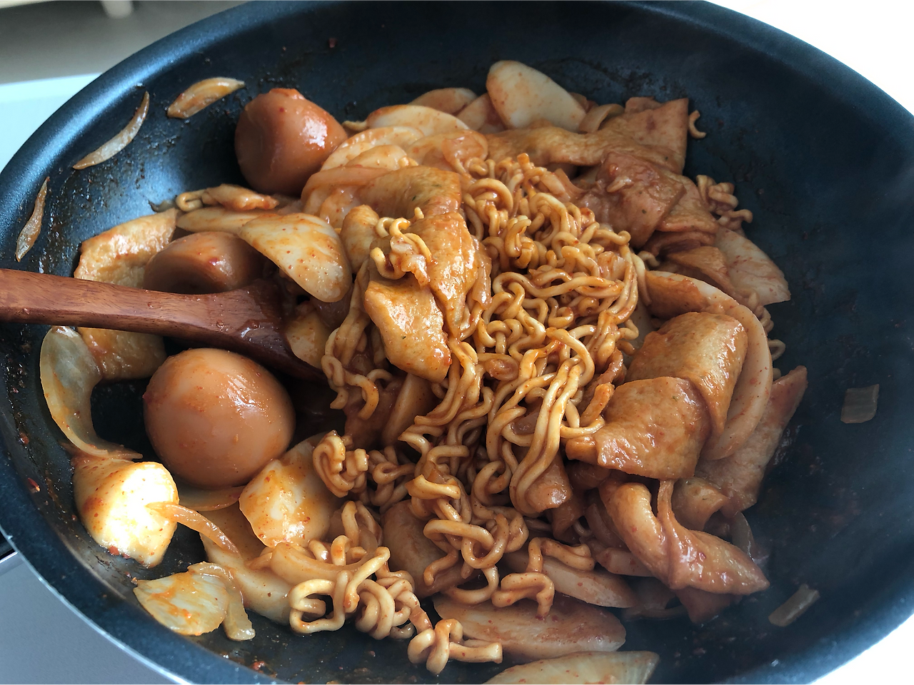 요런 벌건 비주얼이 나오고 벌벌 끓기 시작하면 라면 사리와 삶은 계란을 넣는다. 라면 사리가 없어서 짜파게티 면을 넣었는데 물이 부족해서 좀 덜 익었다. 삶은 계란은 집에서 먹으려고 산 훈제 계란을 댜신 넣었다. 이건 성공.