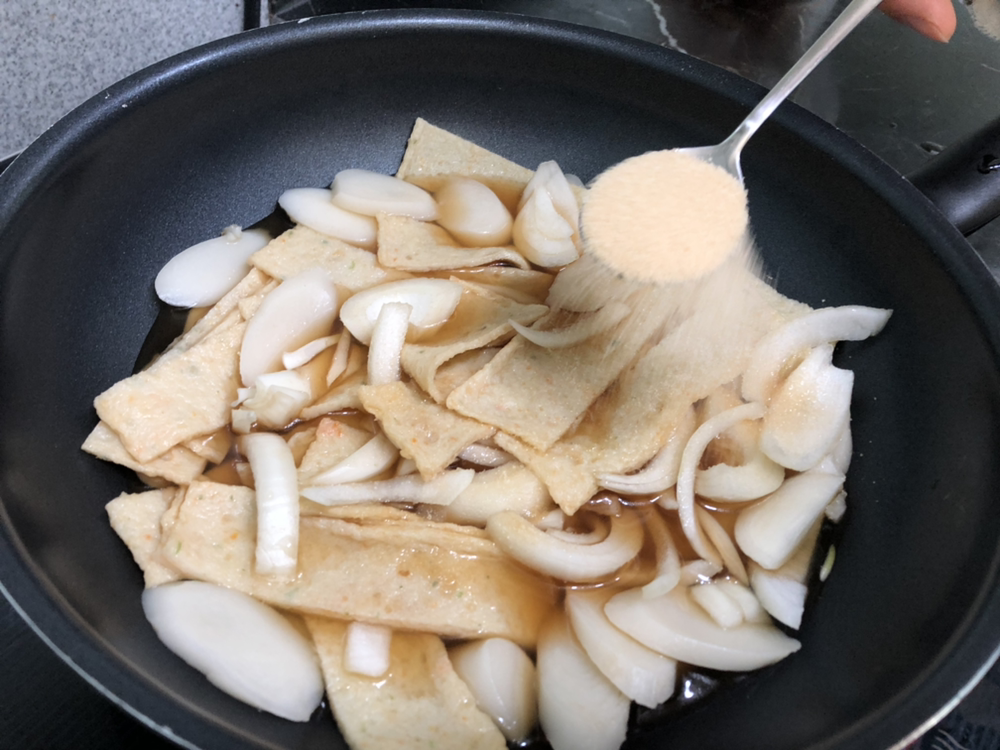 그 다음은 설탕이다. 사실 이 레시피는 백종원이 마리텔에서 알려준 건데 설탕 세 숟가락을 넣으라고 되어있다. 누가 슈가보이 아니랠까봐. 우리는 대신 설탕은 한 스푼만 넣고, 간 본다음이 싱거우면 물엿을 조금 더 넣어줬다.