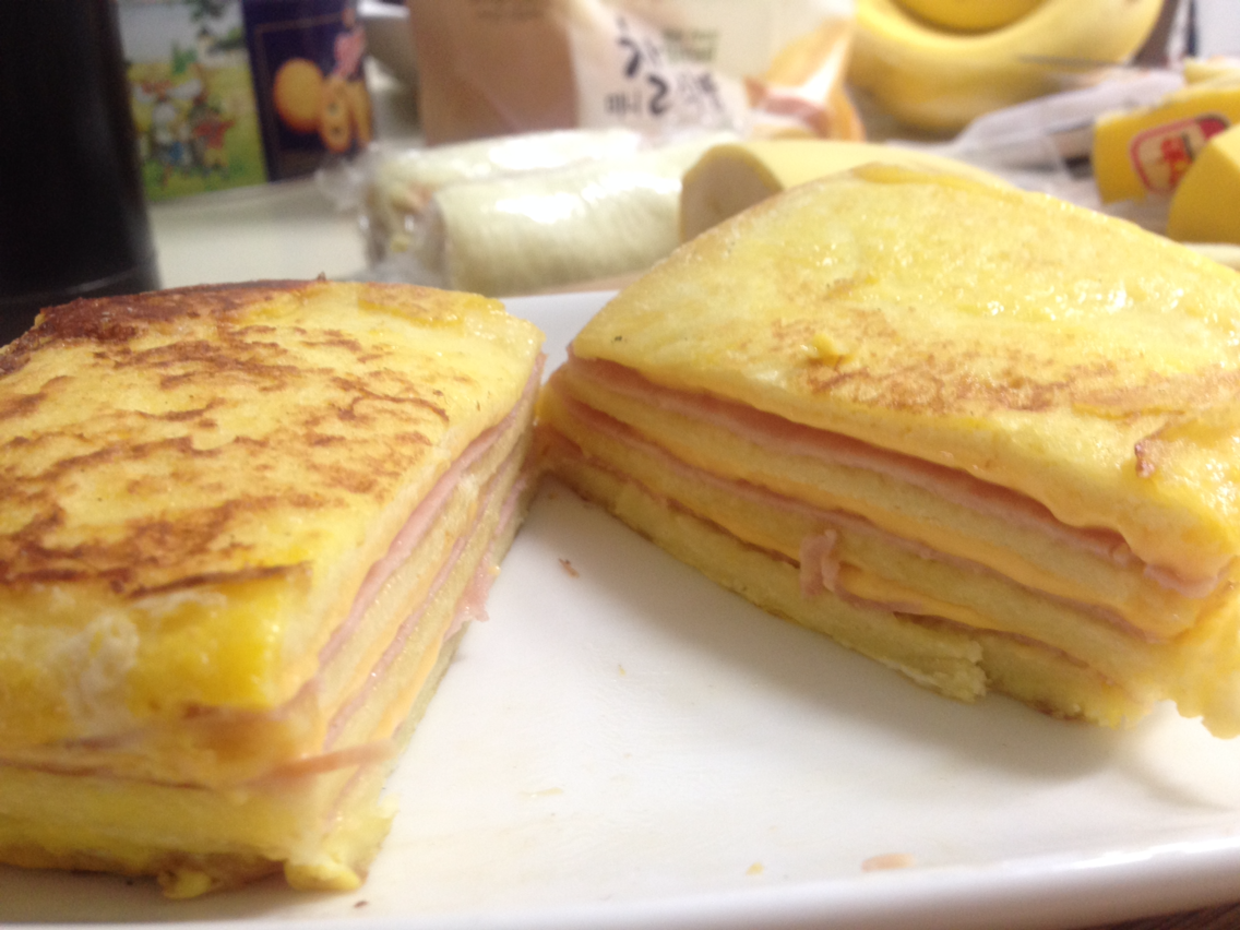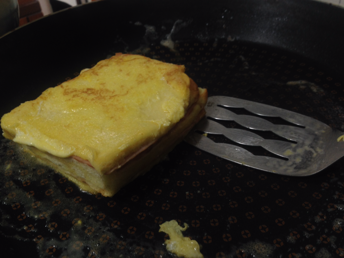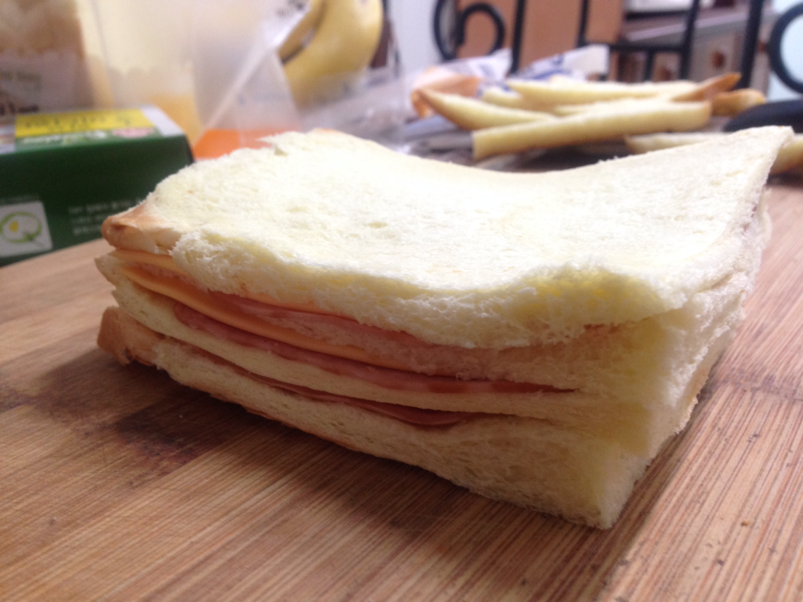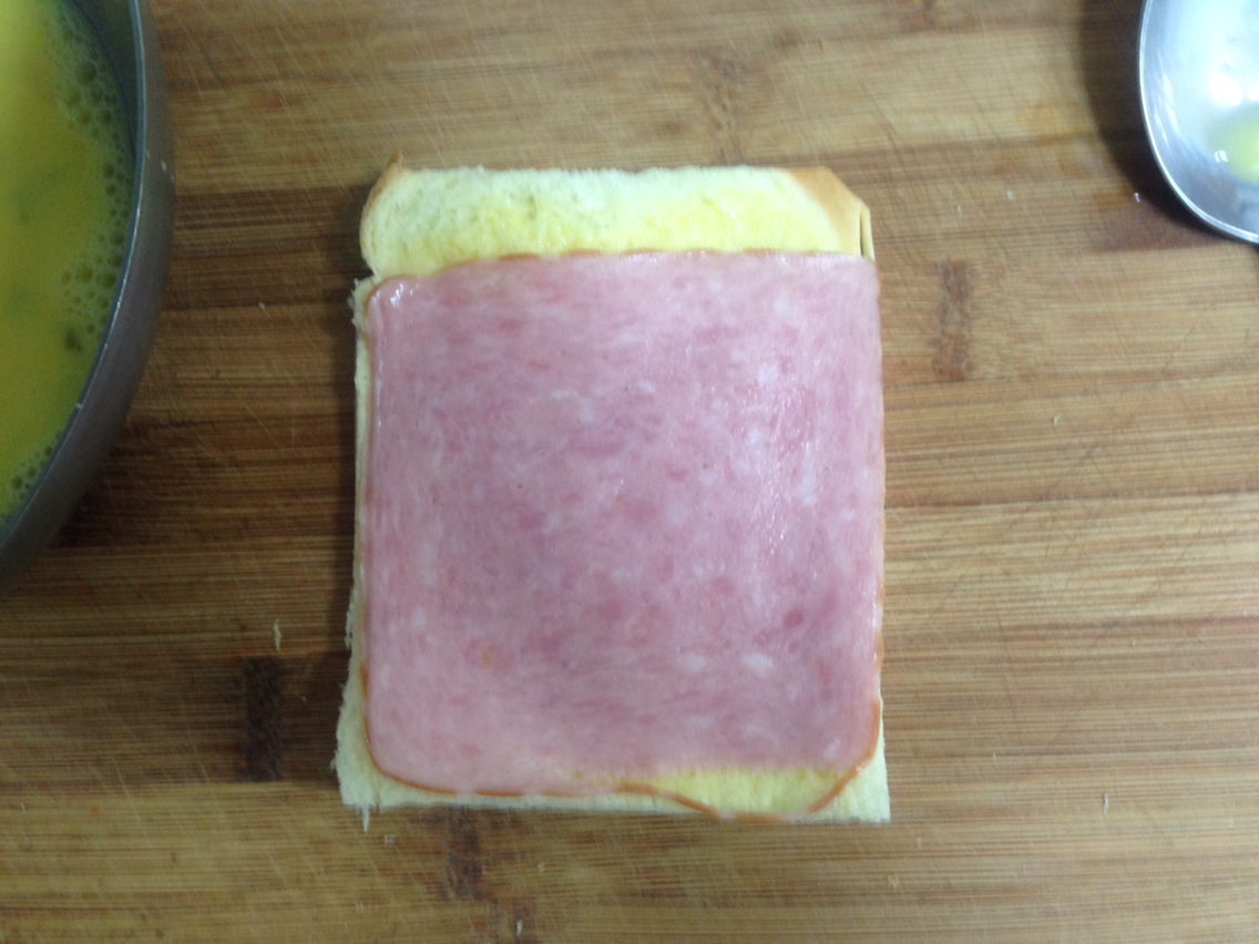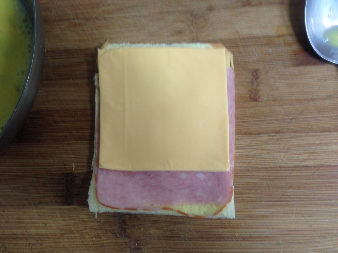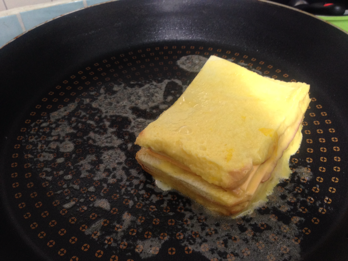 그렇게 똑같은 방식을 세번 반복한다. 빵과 계란을 바르고 햄, 치즈, 빵, 햄, 치즈, 빵이다. 너무 점보가 되는 느낌이 들더라도 무시하자. 원래 토스트는 입안에 가득차는 포만감으로 먹는거다.