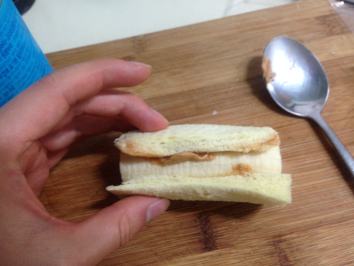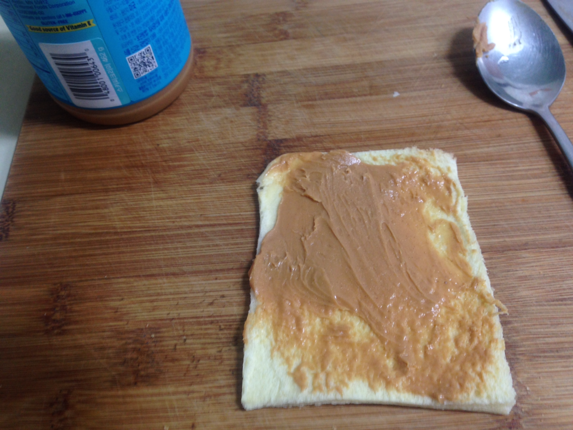 그런데 워낙에 시간이 없기 때문에 토스트를 이거 하나밖에 할 수 없다. 그래서 토스트가 익는 시간 사이에 바나나말이를 만들기로 했다. 아까처럼 촙촙한 식빵 위에 땅콩크림을 발라준다.