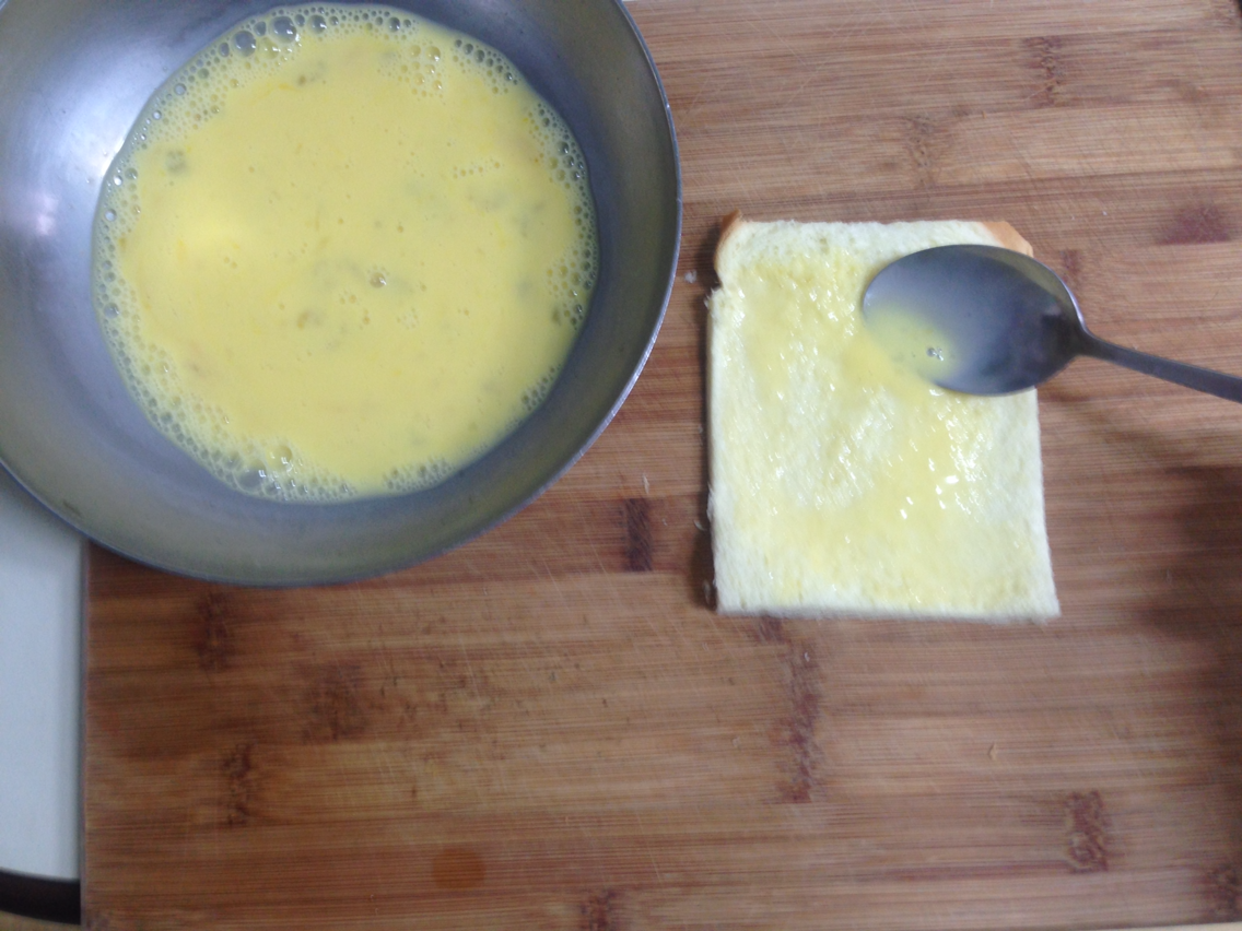 아까 눈물을 뿌리며 만들어놓은 계란을 빵 위에 살짝쿵 발라준다. 숟가락을 이용하면 좋다.