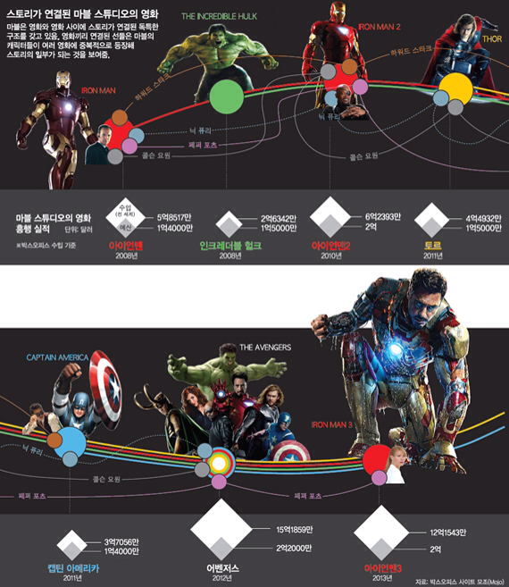 마블은 지금 영화사에서 흔치 않은 역사를 만들어가고 있다. 영화가 영화를 공유하는 마블 시네마틱 유니버스. 007시리즈, 인디아나존스 시리즈 등 같은 전통적으로 인기있는 프랜차이즈에서 더 진화된 형태로 - 프랜차이즈가 프랜차이즈의 모태가 되고 또 그 시리즈끼리 만나기도 하는 - 말그대로 영화 하나에 빠지기라도 하면 영원히 마블 영화를 관람해야 하는 개미지옥 구조를 가지고 있다. 관객을 끌어들이는 법을 터득한 것이다.
