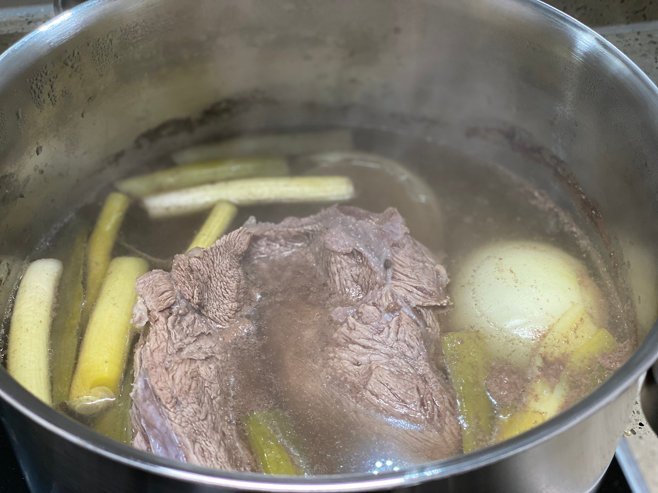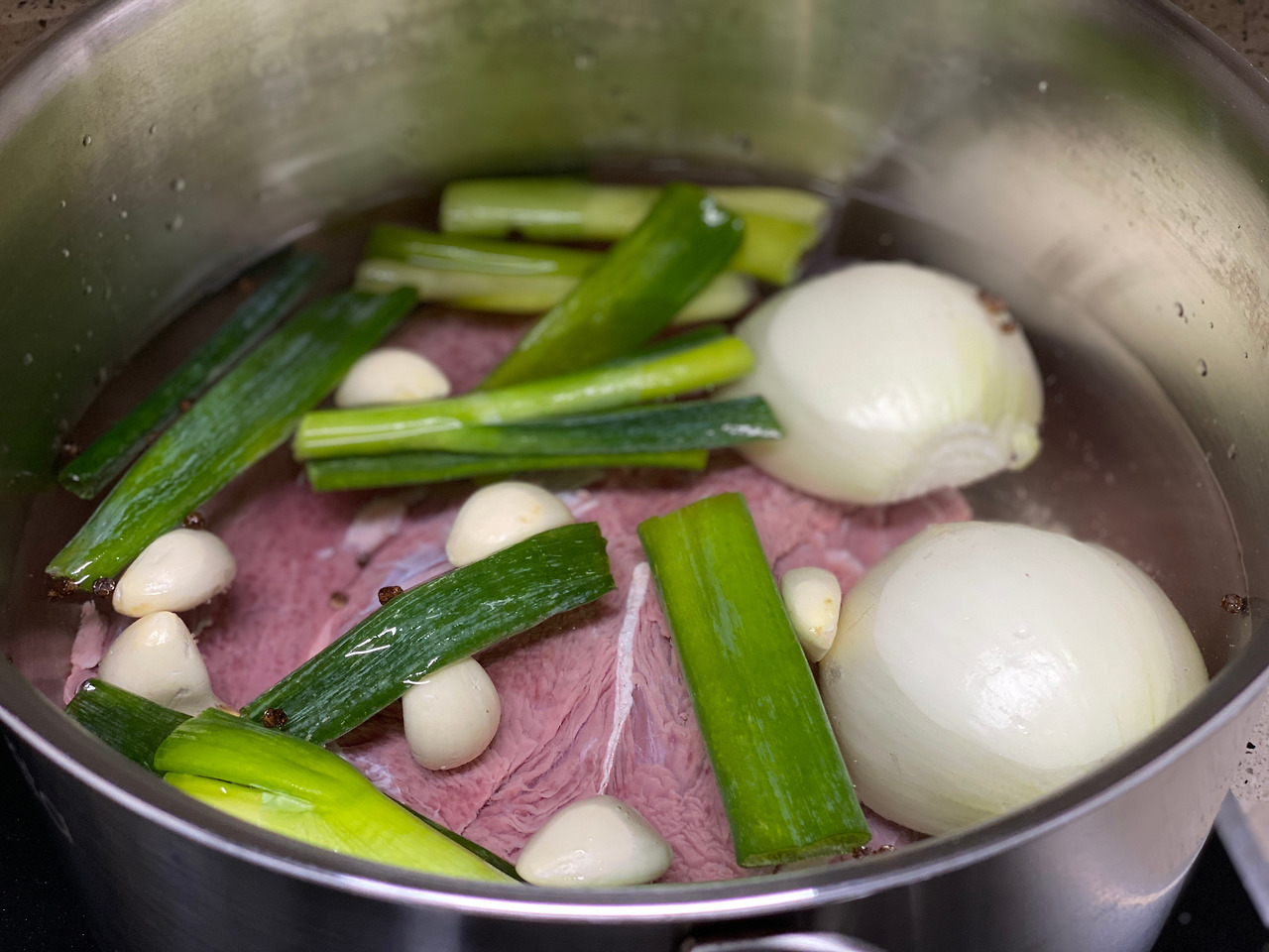 다음은 수육 삶는 것과 동일하다. 마늘 몇 개, 양파 하나 정도, 대파, 통후추 몇 알, 청주 한 컵 정도 넣고 사태가 잠길 정도로 물을 넣어준다. 이렇게 한 시간을 푹 삶아준다.
