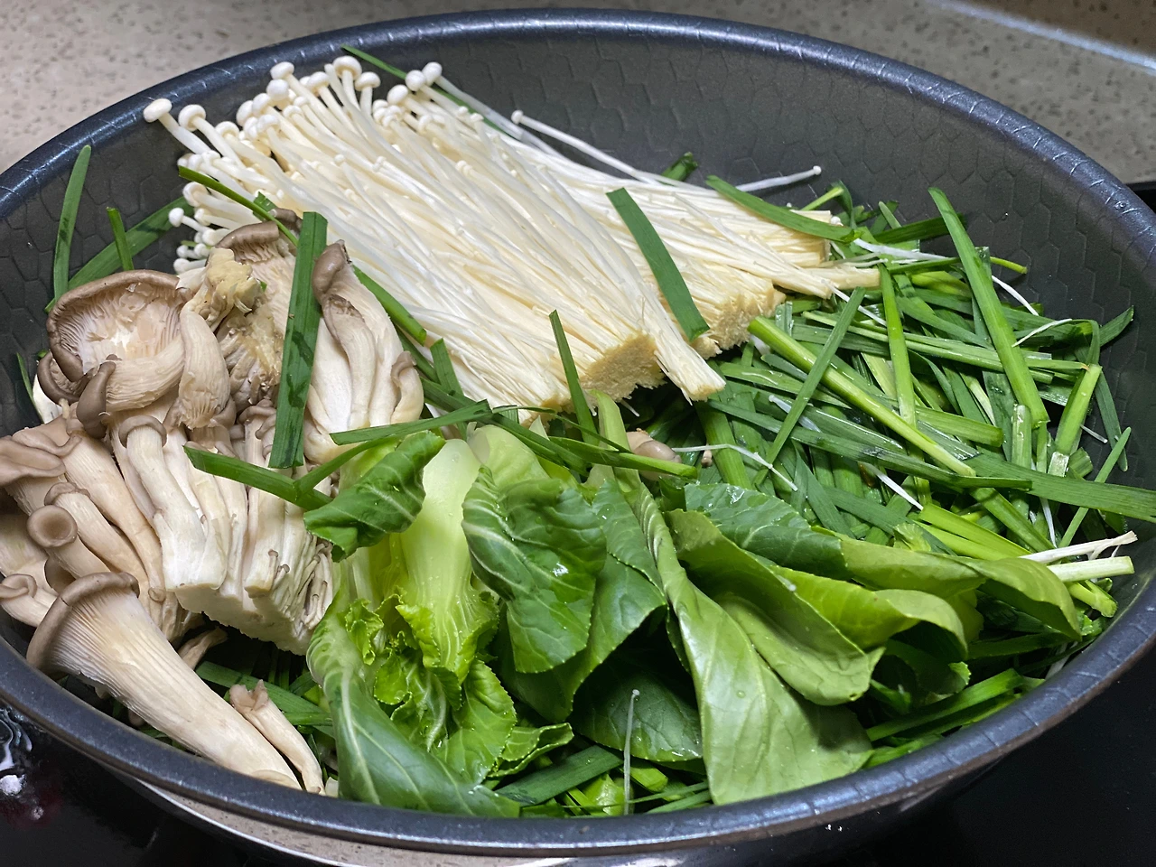 자 이제 전골 세팅이다. 야채는 마음껏 준비한다. 부추나 쪽파는 필수. 우리는 부추파. 야채가 생각보다 많이 필요하다. 전골은 야채를 많이 먹게 되는 아주 좋은 음식.