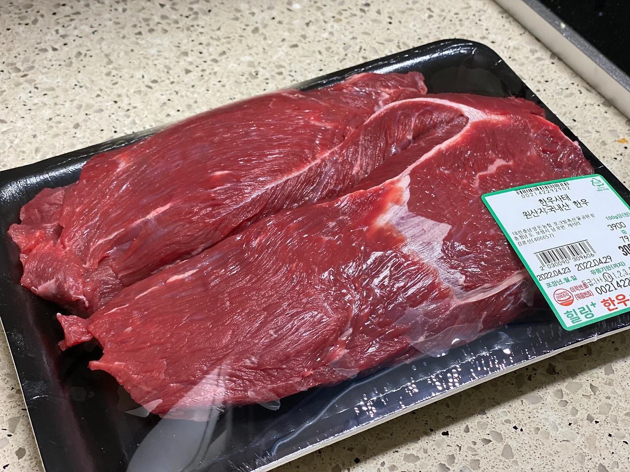 하지만 당일이 되니 마음이 변해 700만으로는 부족할 것 같았고 800을 이야기하니, 다행히 즉석에서 고기를 달아 추가해주었다. 온라인에서는 1킬로에 2만 원 조금 넘게 수입산으로 살 수 있는데 우리는 정육점에서 3만 원 정도 주고 샀다. 전화할 때 한우인가요? 물어보고 가격을 미리 물어봤는데 옆에서 B가 고개를 끄덕이는 걸 보고 그냥 GO 했다.
