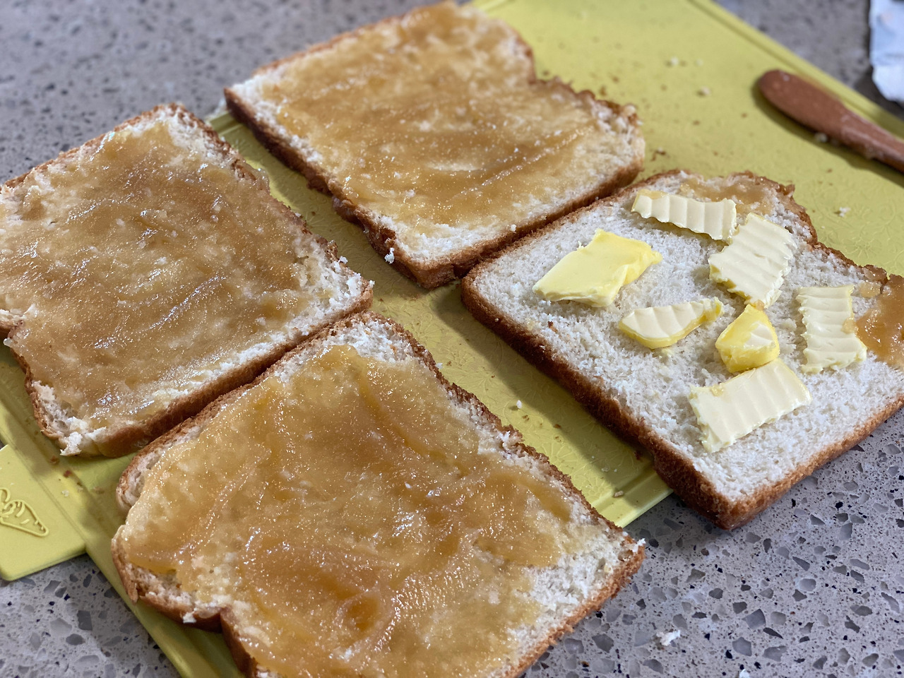 그리고 핵심 재요는 바로 버터. 한쪽 면에 잼을 발라주고 빵이 아직 뜨거울 때 버터를 같이 올려준다. B는 잼만 있는 걸 주문했기 때문에 내가 먹을라고 하나만 만들었다.