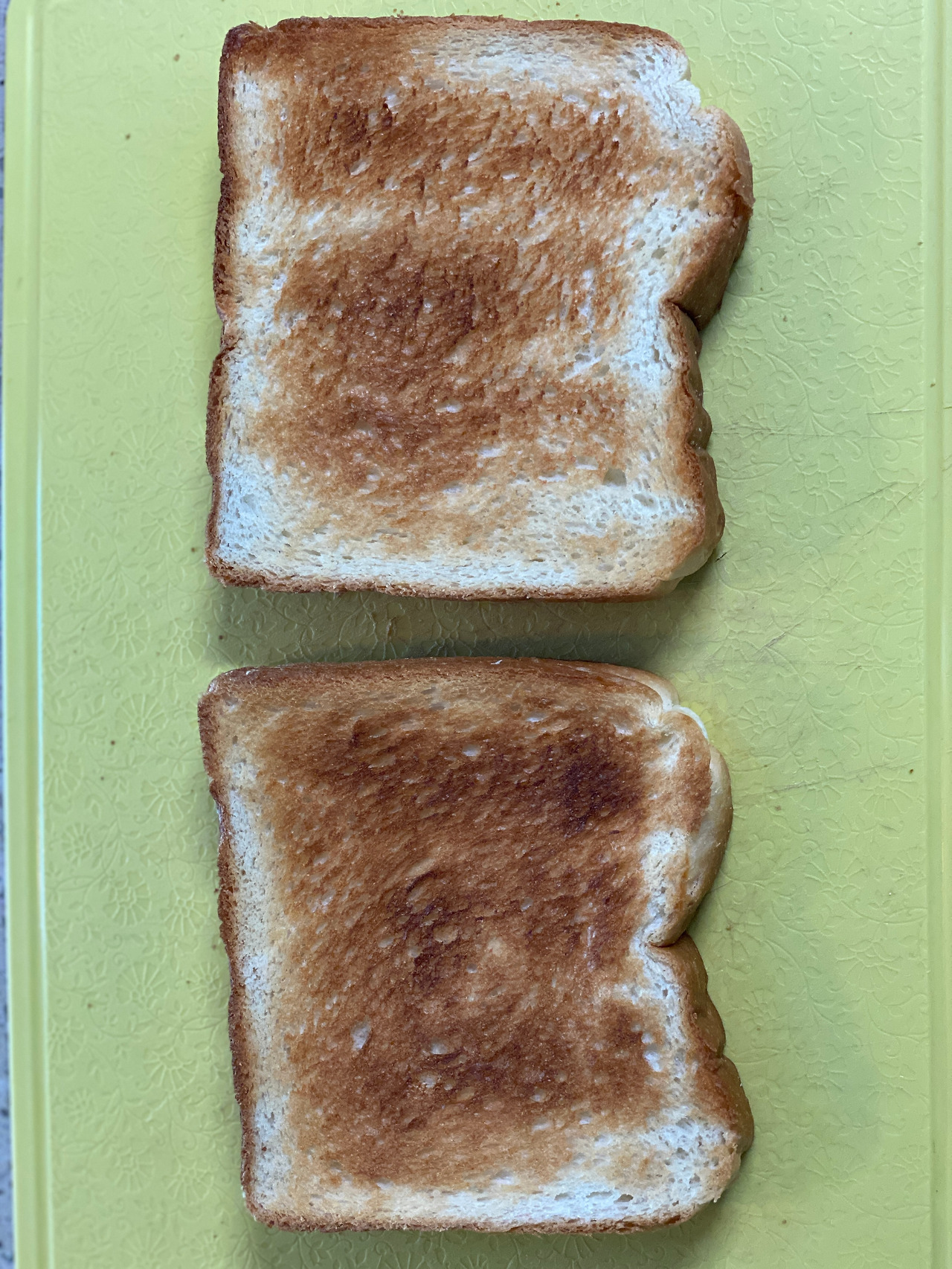 흠 너무 태웠나. 아니다. 이 정도는 돼야 한다. 왜냐면 식빵을 반으로 쪼개 줘야 하기 때문이다. 카야토스트의 핵심은 얇은 빵. 얇은 빵 자체를 사도 좋지만 잘 찾기 힘들걸. 식빵을 반으로 자르면 얇기가 딱 맞다.