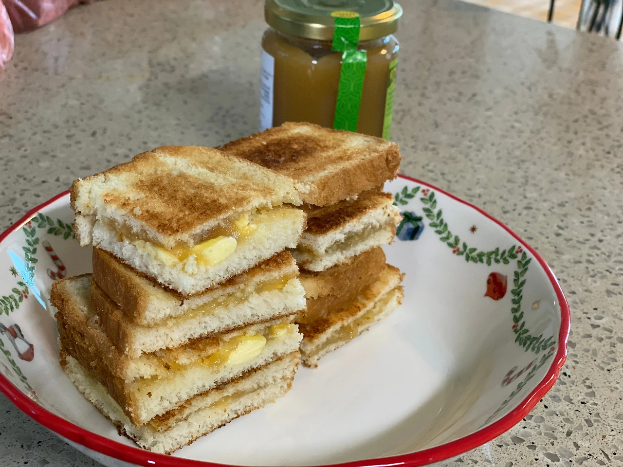 조립한 다음에 4등분 하면 간단히 카야토스트 완성! 달달하기 때문에 커피랑 딱이다. 아침으로도 딱 좋다. 좀 오래 두면 금세 눅눅해지기 때문에 갓 나온 바삭할 때 먹는 걸 추천.