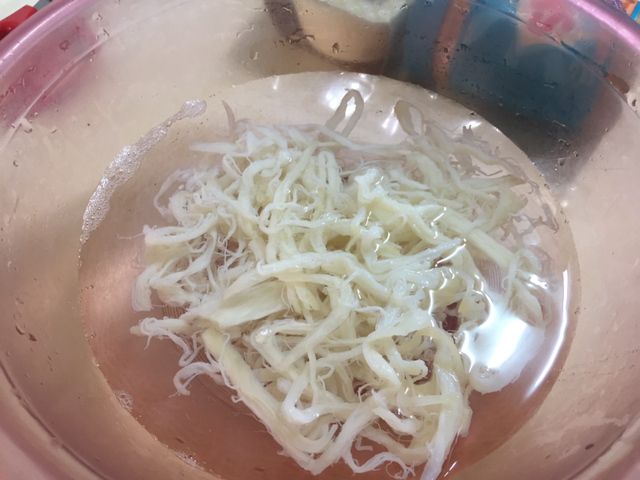 먼저 진미채를 뜯어서 물에 불려준다. 한 5분 가량. 왜 불리는지는 모르겠지만 아마 오징어의 딱딱한 부분을 부들부들하게 만들어주기 위함이 아닐까 싶다.