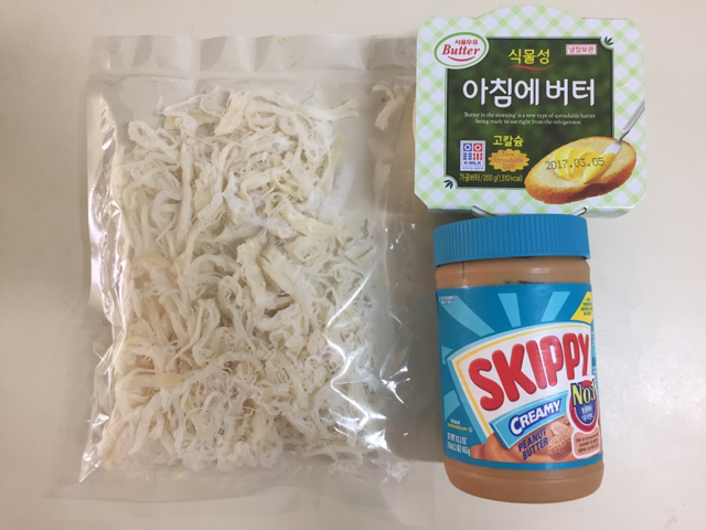 재료는 다음과 같다. 진미채. 버터. 땅콩버터. 그리고 설탕. 아 간단한 재료 너무 좋아.