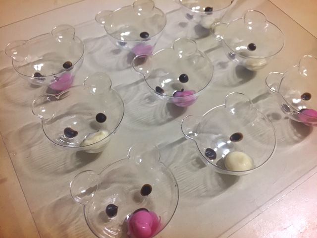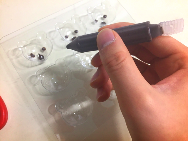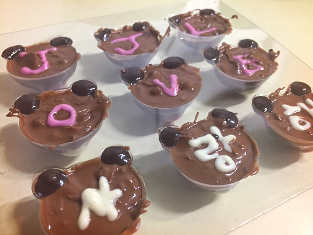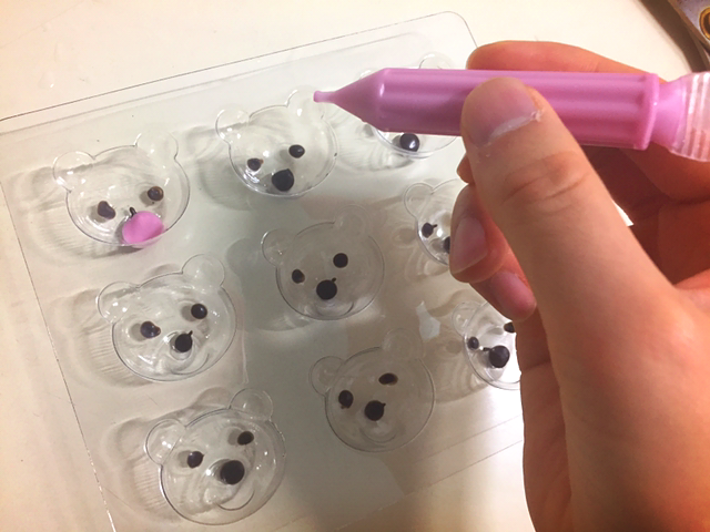 다음은 요 색깔펜이다. 이것도 한 손이 따딴한 정도의 물에 물렁물렁하게 녹여준다. 초콜릿이 금방 굳기 때문에 말랑말랑이 포인트다. 그건 그렇고 적녹색약이라 어디에 무슨 색을 써야 하는지 한참 헷갈렸는데 그게 아니였고 화이트와 핑크는 모두 입 부분에 번갈아서 쓰이는 용도였다.