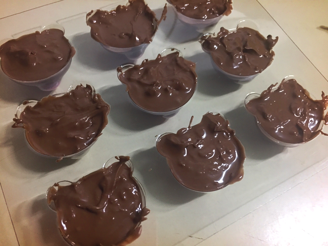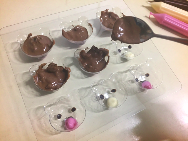 다음은 핑크 입을 만들거다. 초콜릿이 금방 굳기 때문에 스피드가 중요하다.