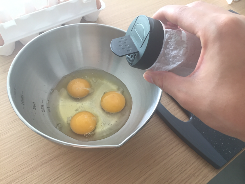 두명이 먹을 분량은 달걀 세개면 넉넉하고 남는다. 소금을 약간 쳐서 간을 맞춘다. 톡톡. 그리고 휘이 저어준다. 마치 내 손의 브레이크가 고장난 1톤 트럭이 된듯이.