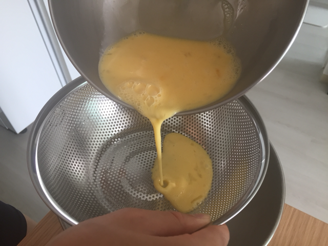 계란물을 채에 한번 걸어준다. 건더기나 이물들이 걸러져 더 부드러운 오믈렛을 만들수 있다(뇌피셜).