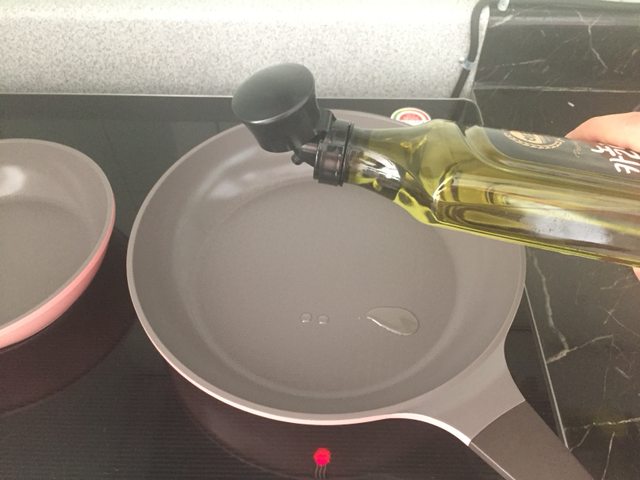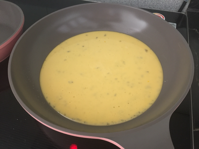 불을 올리고 기름을 두른다. 기름은 너무 많이 하지 말고, 더욱 중요한 건 불의 세기다. 불은 중불에서 약한 정도. 달걀물이 서서히 익혀져야 오믈렛을 만들 수 있기 때문.