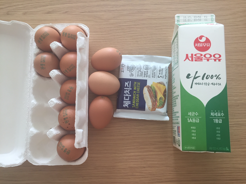 냉장고에 아직 뭐가 없었기 때문에 있는 계란과 우유로, 그리고 아침에 산 치즈로 오믈렛을 만들어보기로 했다.