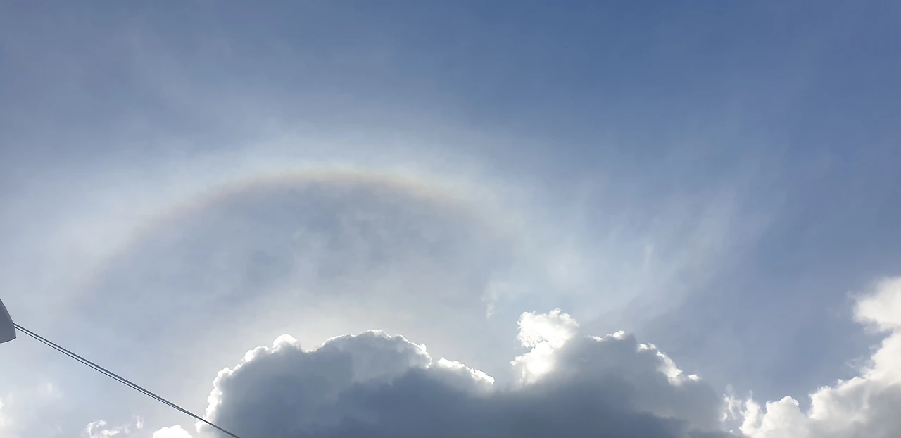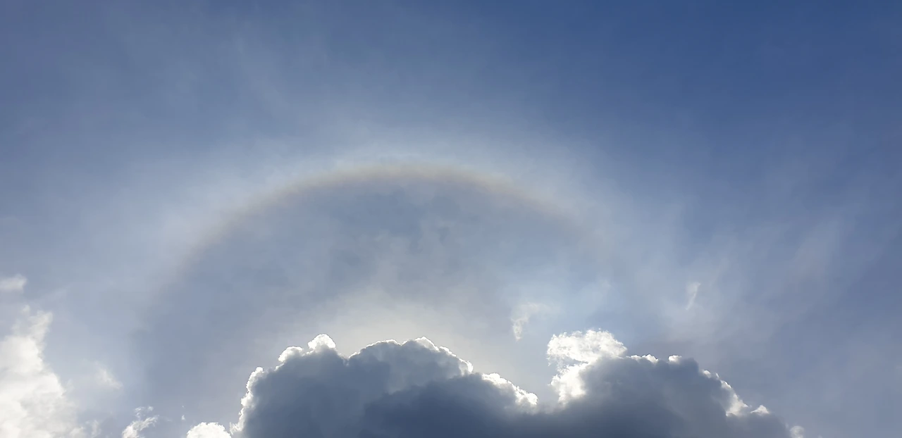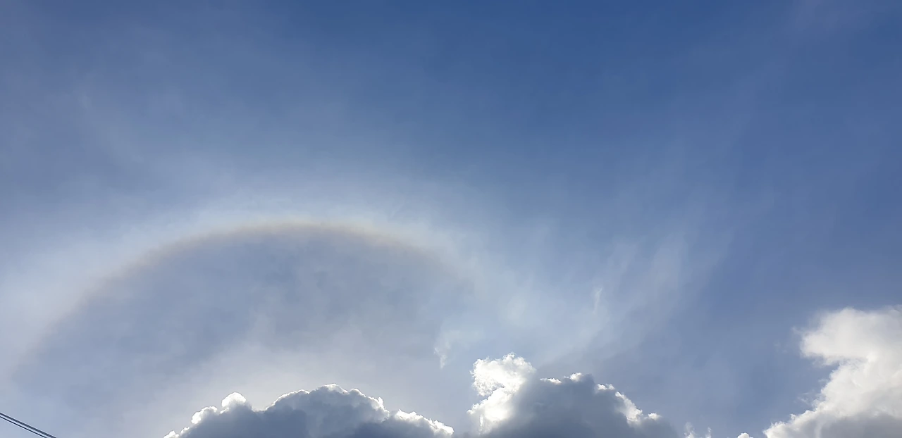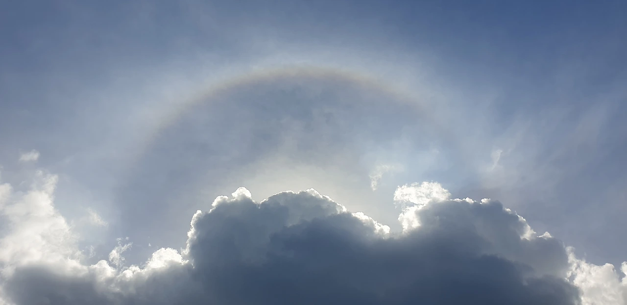 올려다본 하늘은 구름 사이로 빛나고 있었고, 희망처럼 떠 있는 옅은 무지개.