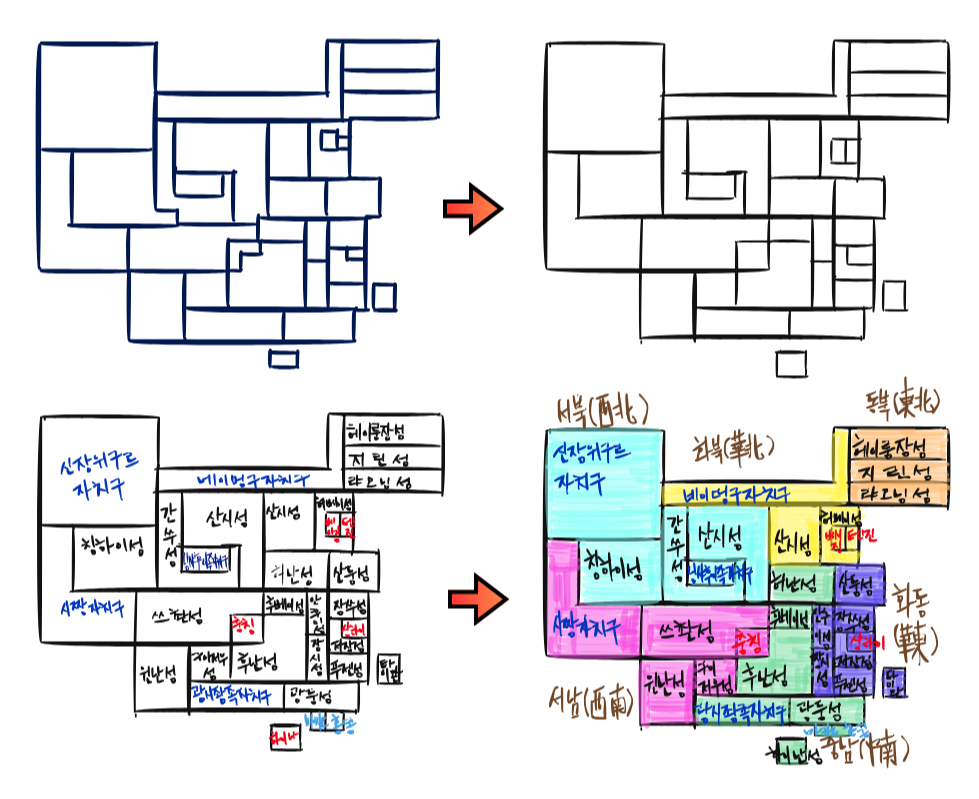 각 지역 간 경계를 보다 단순한 표(表)와 같이 구분했습니다. 들쭉날쭉한 경계는 순서로 기억하는 것을 방해합니다. 벽돌을 쌓을 때 가로와 세로 맞추면 더 견고하고 높은 벽을 세울 수 있습니다. 형상이 불분명한 돌멩이를 쌓는 것은 예술 작품이 될 수는 있겠지만, 높고 튼튼한 구조물이 되진 못합니다.