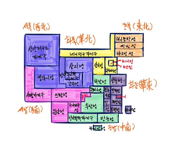 이상 중국의 6개의 구역을 중심으로, 23개의 성(省)과 5개의 자치구, 4개의 직할시를 알아보았습니다. 하나의 중국을 표방하며, 양안관계(중국과 대만의 관계), 소수민족 자치구의 동화(同化) 정책을 표방하는 중국의 모습은 행정구역 지도를 통해서도 엿볼 수 있습니다.