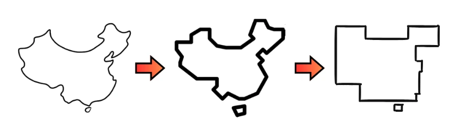 중국 면적은 960만 km²으로 남한(10만 km²)의 96배나 되는 큰 나라입니다. 색으로 구분해도 변화가 심한 곡선을 그대로 기억하고 따라 그리기는 쉽지 않습니다. 따라서 위치(position)와 거리(distance), 크기(scale)를 왜곡하지 않고 직선으로 단순화시켜 다음과 같이 변형했습니다.