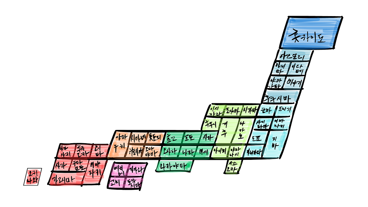 이번 챕터에서는 가깝고도 먼 나라 일본 지도를 단순 직선기호로 그려보고, 47개의 행정구역을 연상법을 통해 기억하는 방법을 안내하려 합니다.