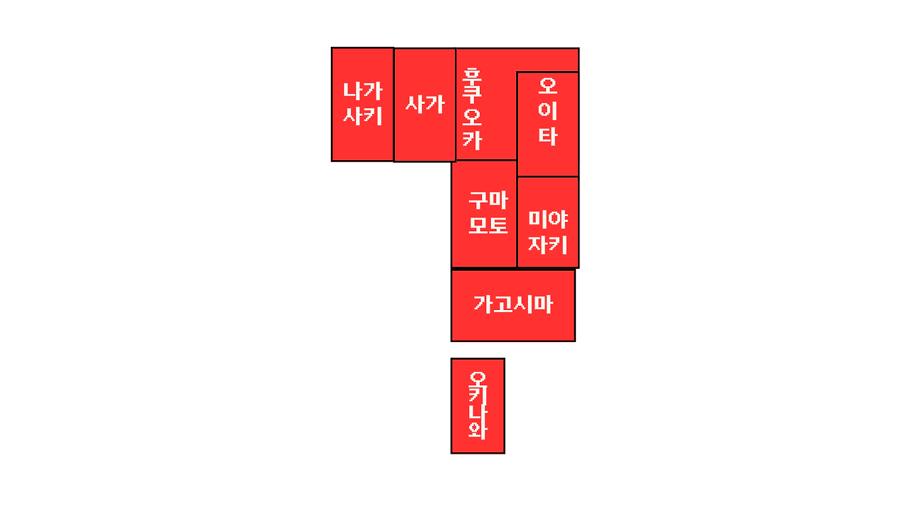 나가사키는 일본으로 들어갈 수 있는 서남쪽의 항구도시로 외국의 문물이 먼저 들어오는 경로입니다. 따라서 짬뽕과 카스텔라와 같은 음식이 유명하죠. 후쿠는 복(福)이라는 뜻이고 오카는 언덕이니 '복 된 언덕'쯤 되겠네요. 그 사이에 있으니 사가, 오이타는 아소산 동쪽 지역이라 벳부 등 온천이 유명합니다. 일본어로 곰은 '구마'이며, 미야자키는 미야자키하야오와 연상시킬 수 있죠. 오키나와는 규슈에 포함하지 않지만, 기억의 편의를 위해 함께 익히도록 합니다.