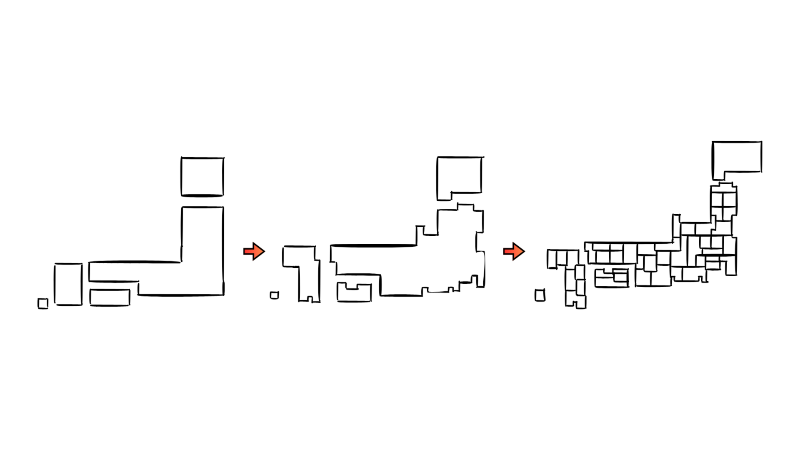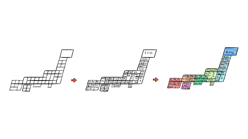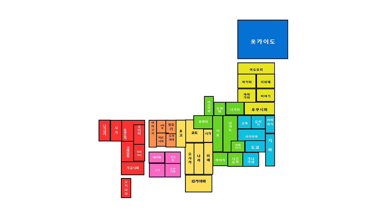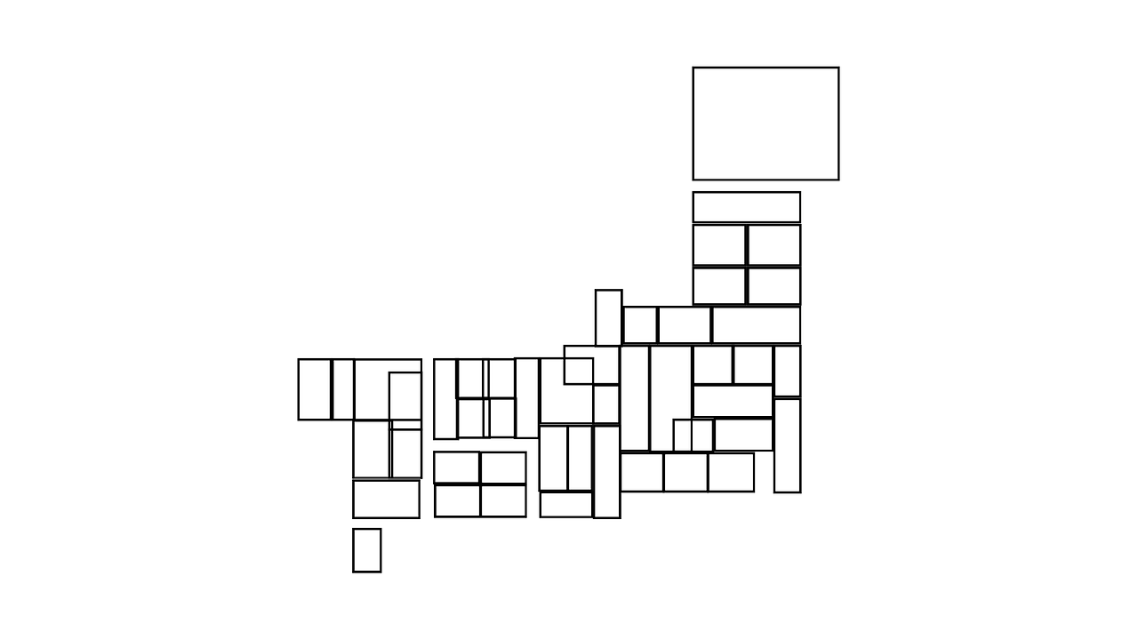 처음에는 4개의 섬과 오키나와를 더해 사각형으로만 축약했습니다. 그러나 일본의 행정구역까지 고려하니 반도와 만을 살리는 것이 필요했습니다. 벽돌처럼 각 지역을 균일하게 집어넣지 않고, 실제 지역의 크기와 경계를 고려하여 다음과 같이 변형했습니다. 행정구역의 표기는 더 정확해졌고, 스케일도 맞아 들어갔습니다.