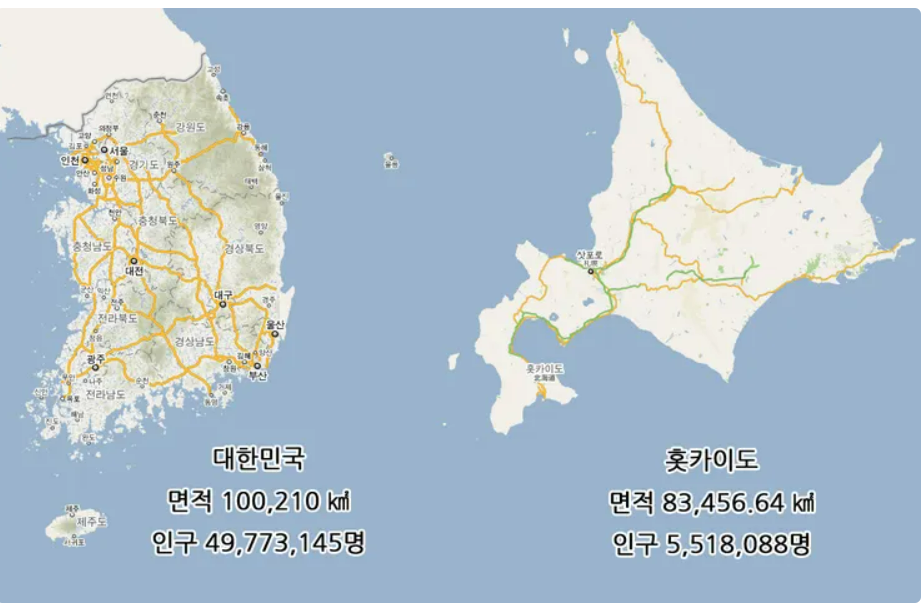 세계에서 7번째로 섬인 일본의 혼슈, 그리고 남한의 80% 면적인 홋카이도만 봐도 꽤 넓은 영토를 가지고 있다는 것을 알고 있습니다. 일본은 실제로 약 38만 km²으로 남한의 3.8배 크기입니다.